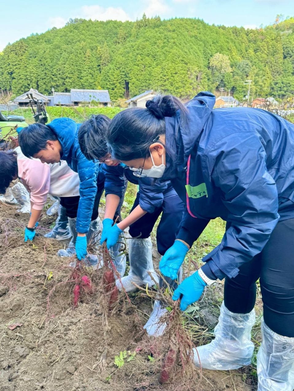 Students harvesting sweet potatoes at the Asuka Village Farm in Nara, Japan, with elderly farmers